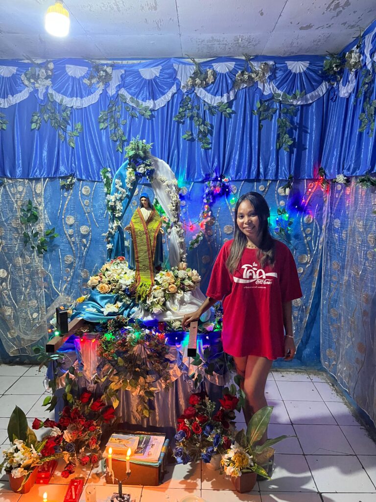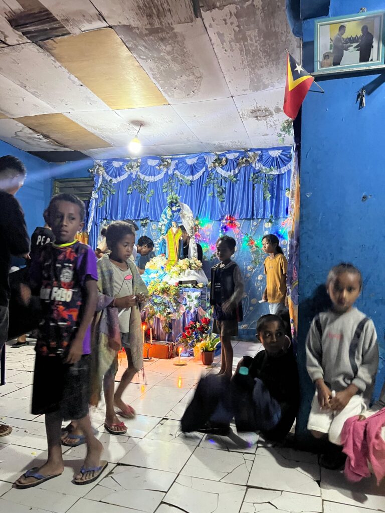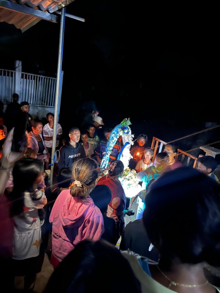 BELOW: The statue of Mary has been making the rounds in Fatuquero and you may remember that about 1 year ago a statue visited my first host family home back in Gleno (with Senor Domingo). Last week it was the turn of our house to host the “na’in feto” statue. This involves the statue being carried from the previous host house (happened to be my good neighbor Maun Tano) with singing and candles, and then brought to rest in our house where we prepared an altar and a “grotto” type decoration. There is then a 1 hour prayer mass in our house where we host the neighbors. The mass includes music and so had a really nice feel to it. Afterwards the visitors are given refreshments and music before being sent on their way. It’s a great community event. Everyone sings ๐.