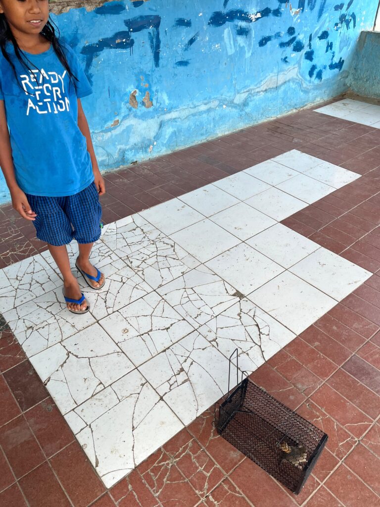 Finally, as any volunteer in Timor-Leste will tell you, all of our homes are also home to rats (laho boot). They generally tend to stay above the ceiling in the home and, when they run around, it sounds like an elephant is running up there. My host sister, Mana Cidalia, has been scared recently by the rats that she sometimes sees at night where her ceiling is not complete. So!! It was time for action. I went to one of the local “loja’s” in Gleno and spoke to the Chinese owner about what he had to catch rats. He was super excited and went into the back of his shop to produce a cage trap. He said I could have it for the “special friend’s price” of $3.50. SO I took it ๐๐. That was 3 days ago. Since then we have caught 3 rats……